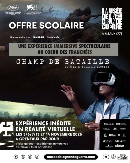 À l’occasion de l’installation d’un dispositif immersif, le musée propose aux collèges et lycées une offre spéciale pour découvrir la vie dans les tranchées en mêlant visite guidée, tranchée immersive et film VR.